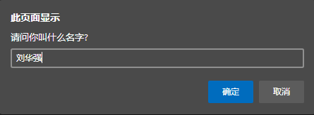 prompt() 不仅能显示信息,还能让用户输入信息,它包含“确认”或“取消”两个按钮,如果用户“确认”按钮,则prompt()方法返回用户在文本框中输入的内容(字符串类型)或者初始值(如果用户没有输入信息);如果用户单击“取消”按钮,则prompt()方法返回null,这三种对话框中,它交互性最强。