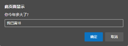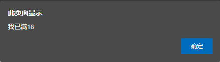 1 <html> 2 <head> 3 <title>编写html页面</title> 4 <script language= "javascript" > //Javascript脚本标注 5 let name,age; 6 name=prompt( "请问你叫什么名字?" ); /*在页面上弹出提示对话框,将用户输入的结果赋给变量name*/ 7 alert(name); //输出用户输入的信息 8 age=prompt( "你今年多大了?" , "我已满18" ); /*在页面上再一次弹出提示对话框,将用户输入的信息赋给变量age*/ 9 alert(age) //输出用户输入的信息 10 </script> 11 </head> 12 </html>