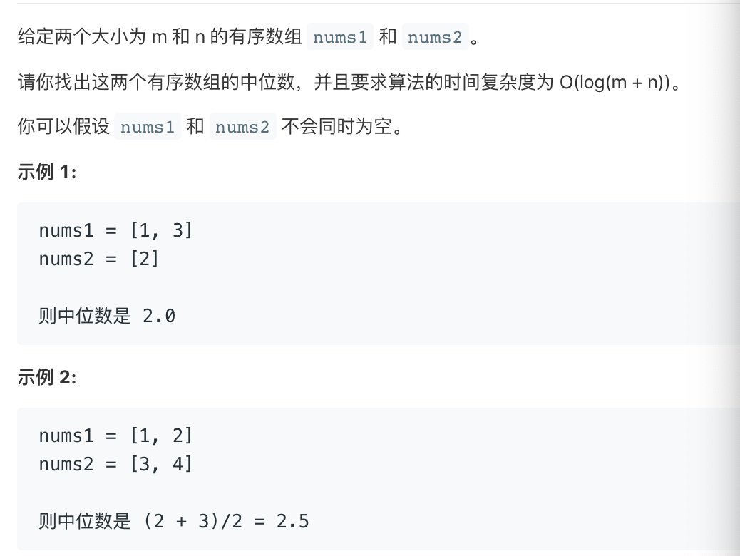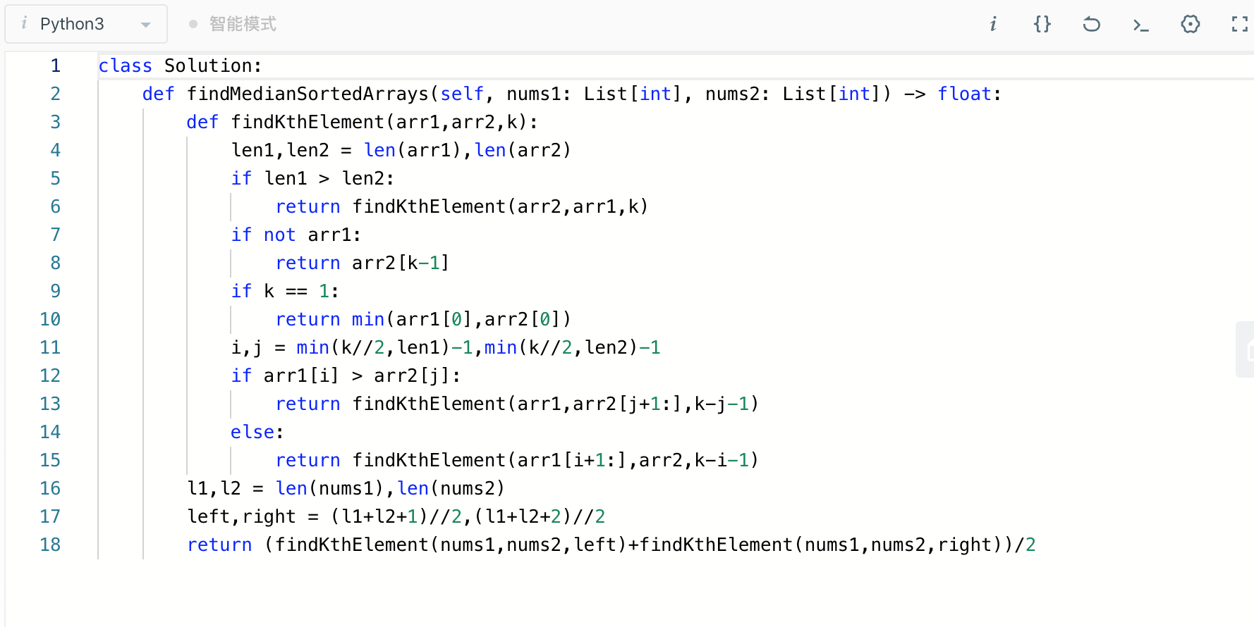 def findMedianSortedArrays(self, nums1: List[int], nums2: List[int]) -> float: l1,l2 = len(nums1),len(nums2) left,right = (l1+l2+1)//2,(l1+l2+2)//2 return (findKthElement(nums1,nums2,left)+findKthElement(nums1,nums2,right))/2 //(findKthElement函数为查找第k个小的数)
