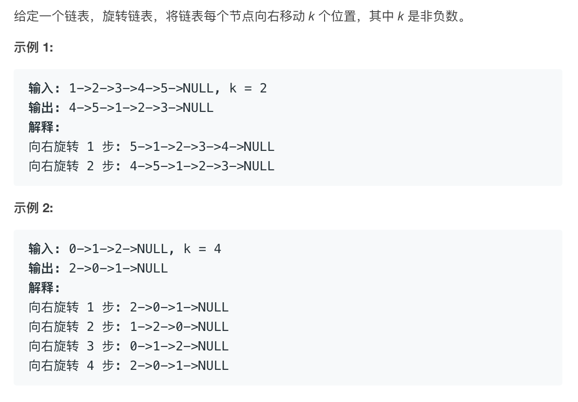 先找到链表最后一个非空节点tail,通过tail.next=head使链表形成闭环。接着从头开始找到第n-k%n 个节点当作new_tail,new_tail.next为new_head,接着再令new_tail.next为null进行开环,返回new_head即可。