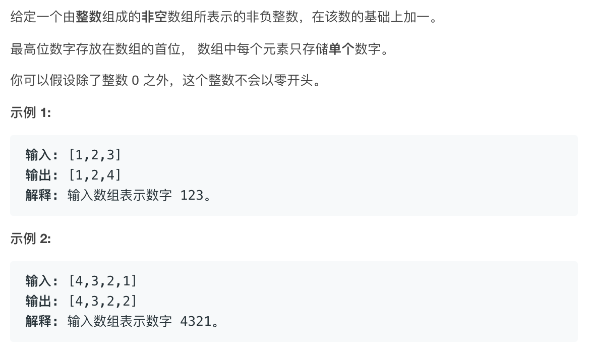 从后向前遍历数组,把相应位置数字加一,同时对10取余,如果不为0,则直接返回加1后的数组,如果为0,代表当前位置的数为9,继续遍历。如果遍历结束都没有返回结果,代表每一位数字均为9,则加一后的结果为原数组长度加一,第一位为1,其余为0。