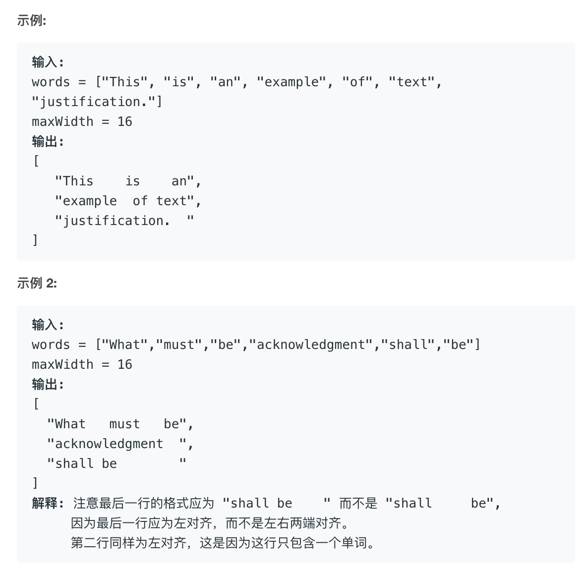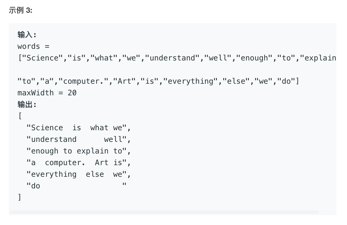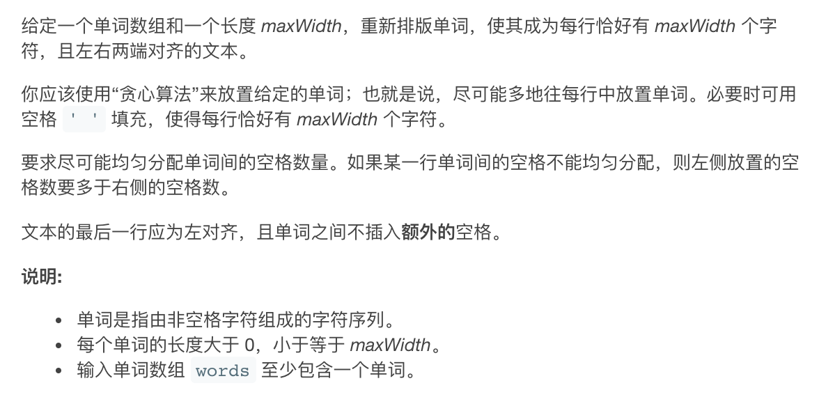 先根据最大长度条件把一维数组转换为二维数组,二维数组中的每个数组是结果中每个字符串包含的所有单词。再对二维数组中每个数组进行加空格处理,这里要注意的是,要对最后一行单独处理。