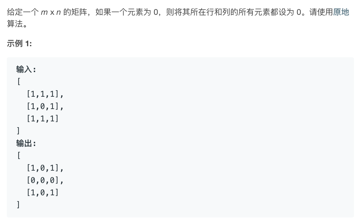 遍历用矩阵的第一行和第一列来标记当前行是否为0,当前列是否为0。