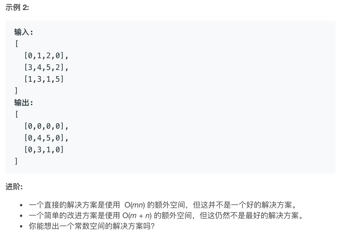 遍历数组,如果遇到0将对应行列里非0元素变为一个足够小的数。再遍历一次,如果元素是那个足够小的数,将其置为0。
