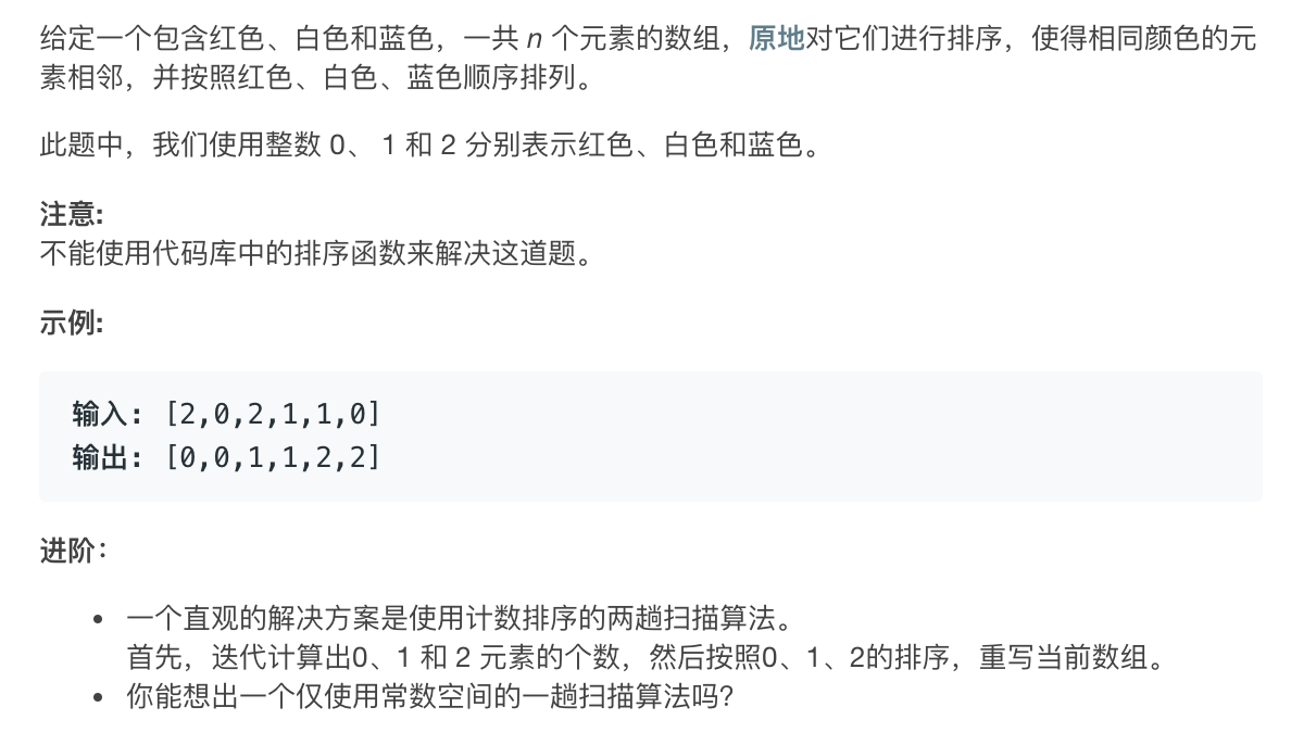 由于排序后数组左侧0开始,右侧2结尾,可以使用两个指针p0记录左侧中0的位置,和p2记录右侧中2的位置。对数组进行遍历,如果遇到0,则与p0指向的元素值互换,p0指向下一位置,继续遍历下一元素。如果遇到2,则与p2指向的元素值互换,p2指向前一位置,继续遍历当前元素。遇到1,继续遍历下一元素。(这里p0继续遍历下一元素,p2还要遍历当前元素,是因为数组是从左向右遍历,p0在左边,也就意味着在遇到0进行交换的时候p0指向的只可能是当前位置0或者1,交换后可以直接遍历下一个元素,而p2指向的元素未知,交换后的当前值如果是2,则需要进行下一次交换)