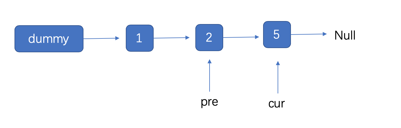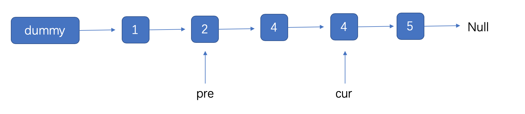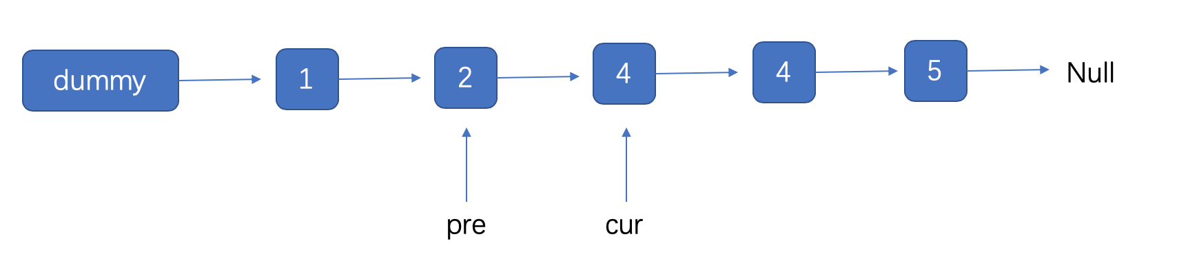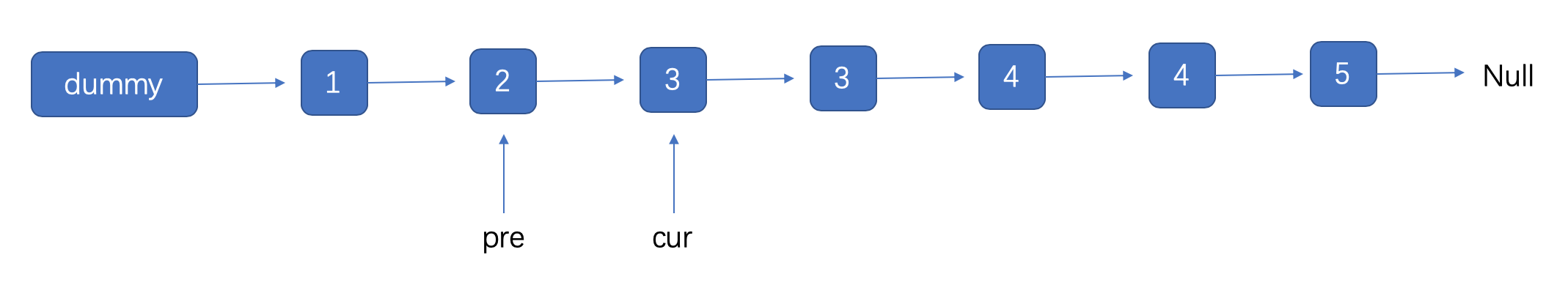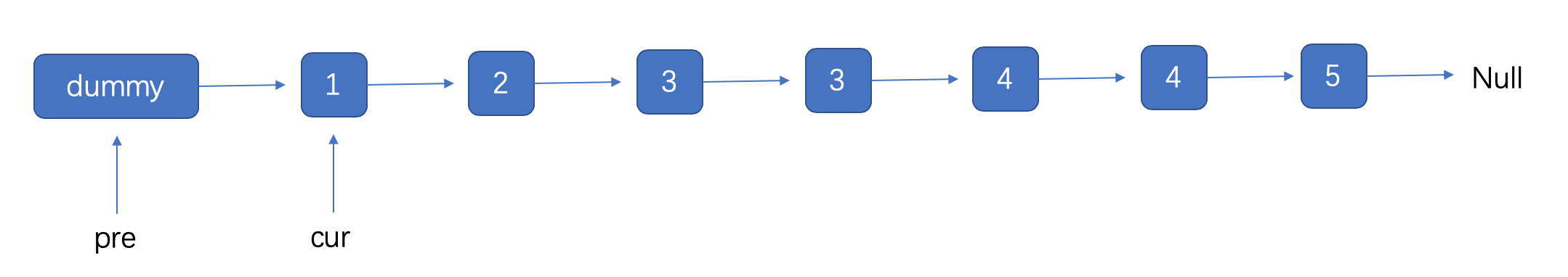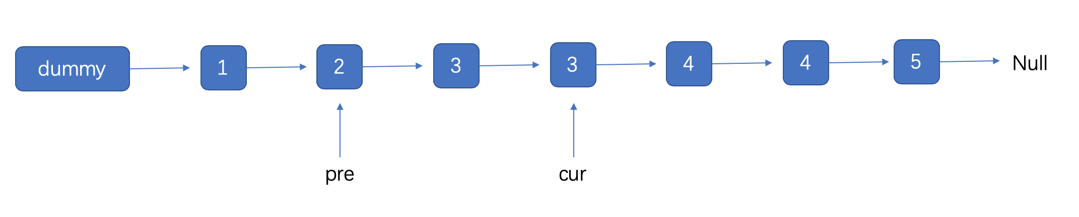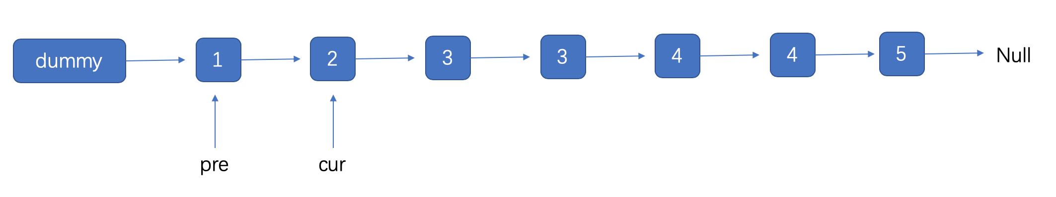 创建一个空的头结点dummy,头节点的下一节点是head。用cur指向当前要处理去重的节点,pre指向上一个完成去重的节点。初始状态pre = dummy,cur = pre.next。开始对cur进行处理,如果cur.next.val == cur.val,while遍历更新cur指向的节点找到最后一个和cur.val相同的节点。然后让pre下一个指向的节点变成最后一个和cur.val相同节点下一个指向的节点,这样达到对cur.val相同的节点的去重操作,也即pre.next = cur.next,cur = cur.next(这里要注意的是,pre本身指向的并没有改变),继续进行遍历去重操作。如果cur.next.val != cur.val,则更新pre和cur的值,即pre = pre.next,cur = cur.next。去重结束后,返回dummy指向的下一节点即可。