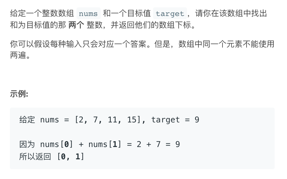 创建一个hash表,将数组中的元素值作为key,下标作为value。遍历数组时,只需要查看target减去当前元素值所得到的值作为key是否在hash表中出现过即可。