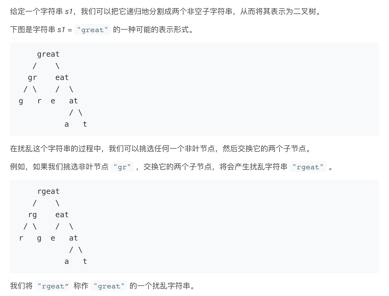 class Solution: def isScramble(self, s1: str, s2: str) -> bool: if len(s1) != len(s2): return False if s1 == s2: return True if sorted(s1) != sorted(s2): return False for i in range(1, len(s1)): if self.isScramble(s1[:i], s2[:i]) and self.isScramble(s1[i:], s2[i:]) or \ (self.isScramble(s1[:i], s2[-i:]) and self.isScramble(s1[i:], s2[:-i])): return True return False