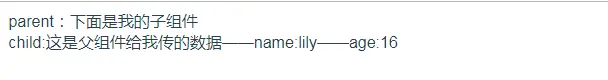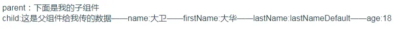1 <template> 2 <div> 3 parent:下面是我的子组件 4 <childSon :name='name' :firstName='firstName' :age='18' ></childSon> 5 </div> 6 </template> 7 <script> 8 import childSon from './Childs' 9 export default { 10 name:'Parent', 11 components:{ 12 childSon 13 }, 14 data(){ 15 return{ 16 name:'大卫', 17 firstName:'大华' 18 } 19 } 20 } 21 </script>