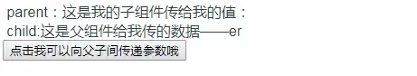1 <template> 2 <div> 3 child:这是父组件给我传的数据——{{con}} 4 </div> 5 </template> 6 <script> 7 export default { 8 name:'Childs', 9 props:['content'], 10 data(){ 11 return{ 12 con:this.content 13 } 14 } 15 } 16 </script>