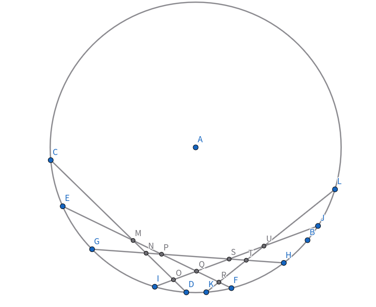 考虑这么一个图,我们考虑最外层的一层框,如图中的 \(C,M,P,S,U,L\) 边框,对于线段 \(PS\),我们计算 \(PFH\) 这个区域黑色区域的数量,首先 \(PS\) 是弦 \(GH\) 的一部分,进而发现每一条起点介于 \(G,H\) 之间的弦都会时区域数增加 \(1\),而与其他因素无关,直接做即可。