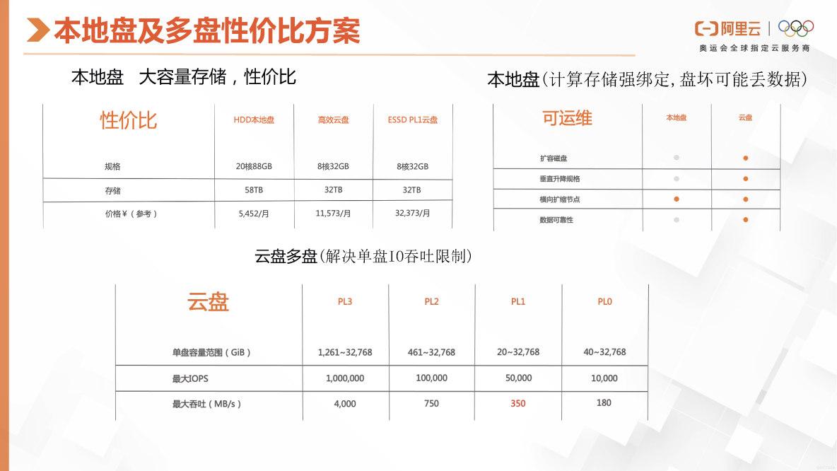 我们将介绍阿里云ClickHouse产品,它是一款主打性价比的解决方案。该产品支持用户购买本地盘,这里有和高效云盘和ESSD在规格和价格上的对比分析。我们可以看到,HDD的成本要比高效云盘低一半,而ESSD的费用是本地盘的六倍多。但使用本地盘也存在一定问题,即数据与计算是强绑定的,如果本地盘损坏,可能会有数据丢失的风险。