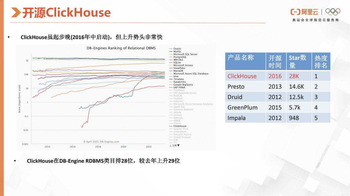 首先来说,我们的ClickHouse是在2019年中旬开源的。虽然开源时间较晚,但它的上升势头非常迅猛。我们可以看到在DB-Engine的关系型数据库类目中,ClickHouse排在第28位,相比去年上升了29位。在DB-Engine的趋势图中,红色曲线表示ClickHouse的增长情况。右侧是GitHub上的Star数,可以看到,虽然ClickHouse开源时间较晚,但相比其他同类型的分布式数据库,其热度排名遥遥领先。