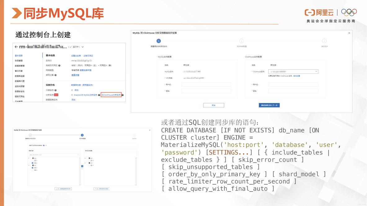在本文中,我们将介绍如何在阿里云ClickHouse中创建从MySQL库同步到ClickHouse的任务。首先,在RDS控制台上,选择分析实例并进入到相应的界面。在此界面上填写RDS或MySQL的用户信息。接下来,在页面上勾选需要同步的库和表,然后点击“创建同步任务”。完成这些操作后,我们便可以在控制台上看到同步任务的状态。