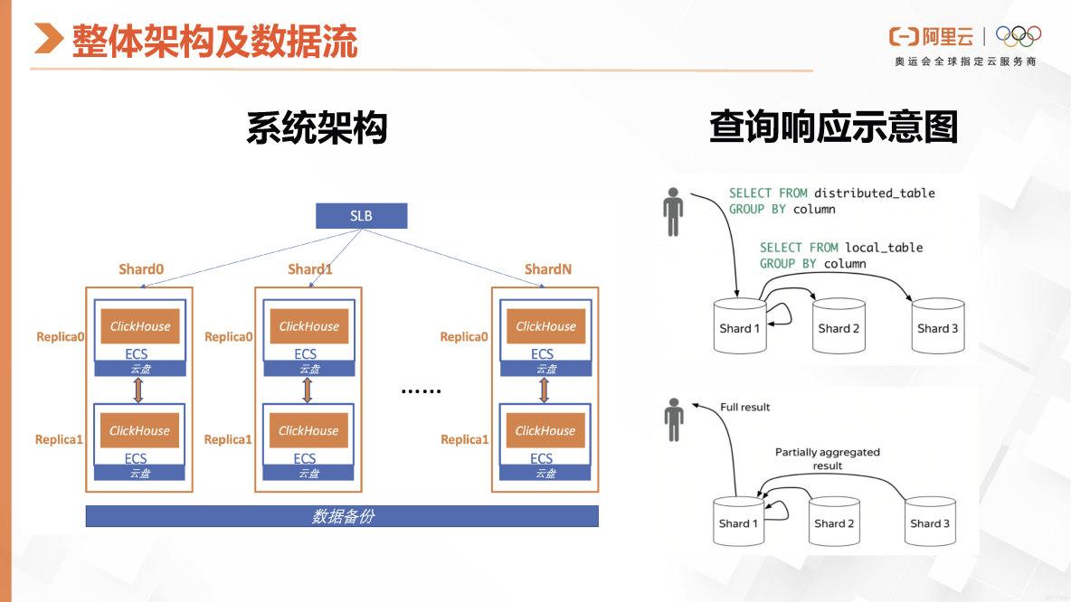 让我们来看看社区版ClickHouse的系统架构。如前面的嘉宾所介绍,ClickHouse是一个Sharding架构。对于集群版的ClickHouse实例来说,首先需要创建分布式表,并在分布式表上定义Sharding key。数据将被下载到不同的计算节点上,并通过节点副本、复制同步机制来保证数据的高可用性。