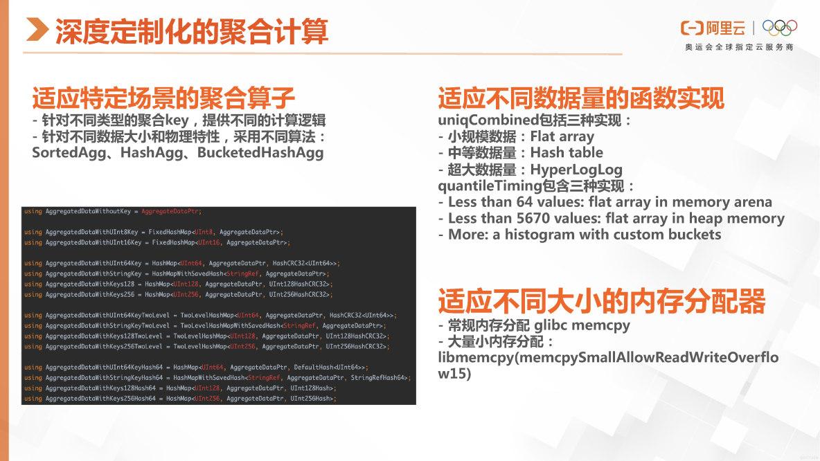 这张图可以看出,ClickHouse在许多场景下都有细致的设计。例如,它在不同的场景中提供了聚合算子,而这些算子针对不同类型的数据提供了不同的计算逻辑。