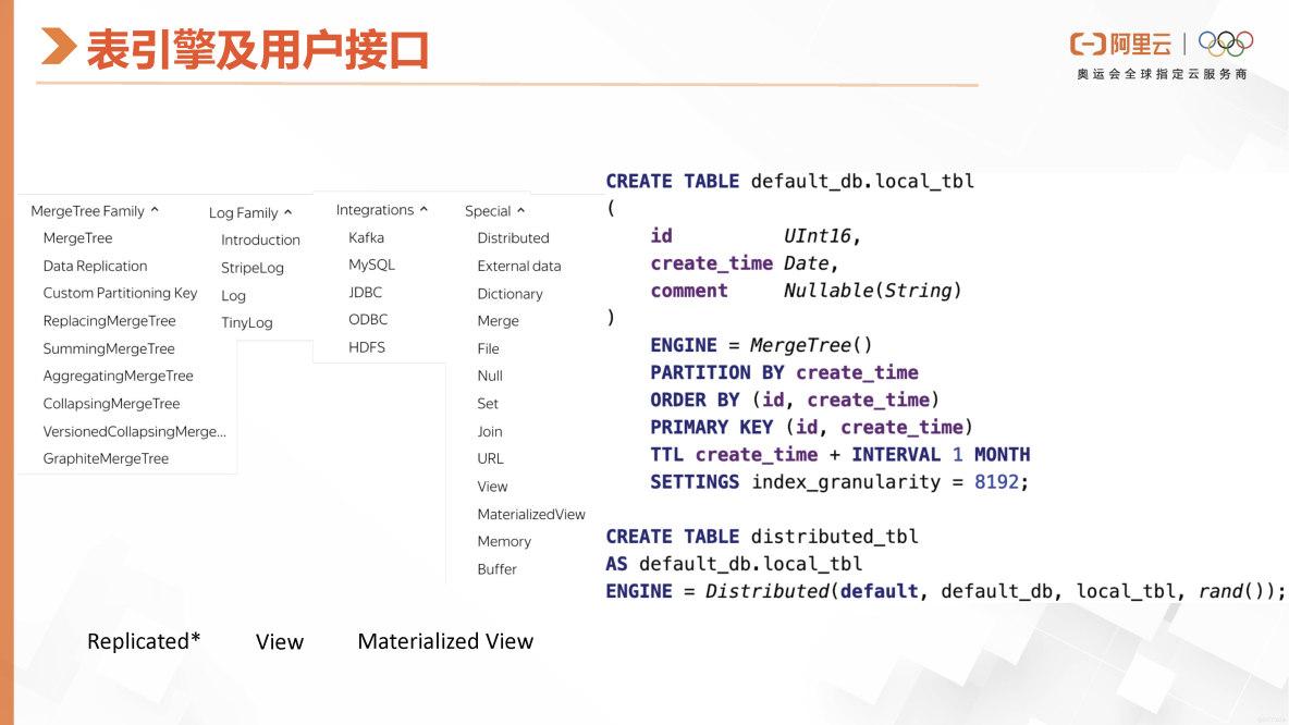 在ClickHouse的其他社区生态或数据同步系统中,创建这些外部表引擎有利于从其他系统同步数据到ClickHouse。右侧的SQL示例展示了ClickHouse用户需要创建的本地表和分布式表,其中本地表必须包含排序键。另外,如果没有指定分区键,它将默认将整个表作为一个分区。用户可以根据某些字段的时间属性或其他属性,指定数据的生命周期,并告知系统哪些数据可以移动到冷存储或删除。