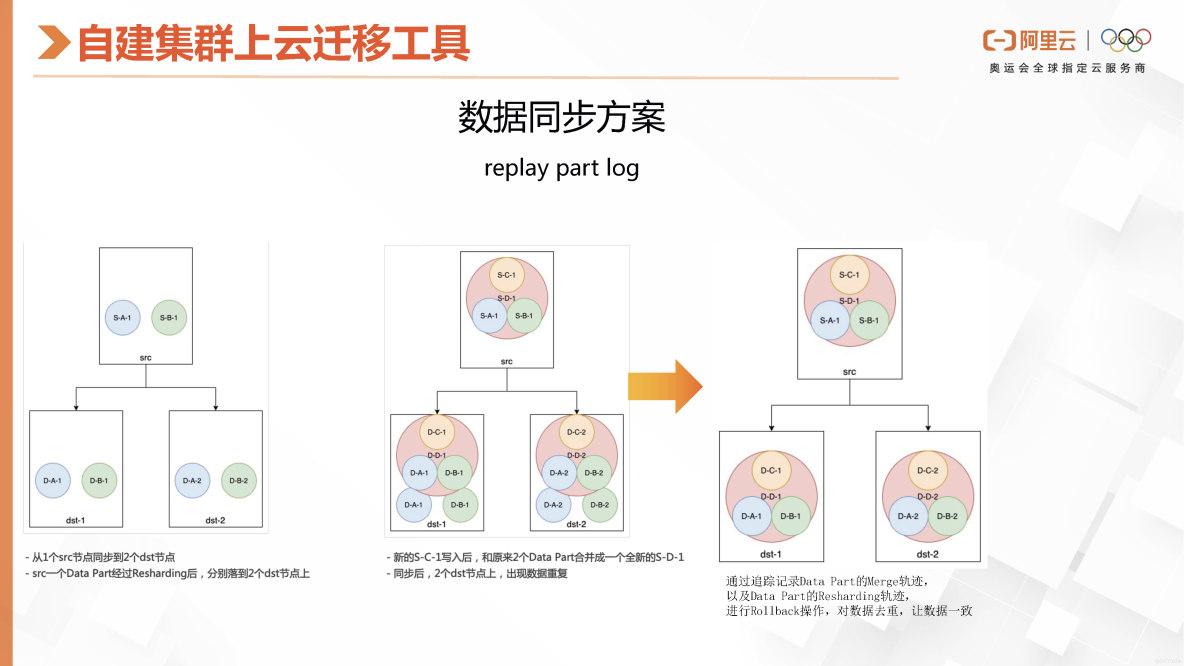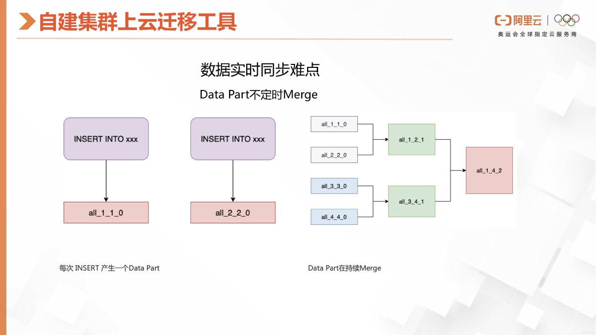 如果用户已经存储了大量数据在自建集群中,但在使用过程中遇到了前文提到的运维困难和其他无法解决的问题,那么可以考虑使用阿里云ClickHouse。我们提供了一个方便的迁移工具,其主要原理是解决数据实时同步的问题。但是数据同步可能存在一个问题,即原有的实例集群会在后台不断地合并Data Part,如果我们在这里捕捉到了数据,有可能在后面就会被合并掉。例如,我开始追踪一个Part并读取它,但当我要同步这个Part时,它源头的集群已经将这两个Part合并成了一个,这样我就找不到了。为了解决这个数据同步问题,我们提供了一个配合Pass Log的方案。