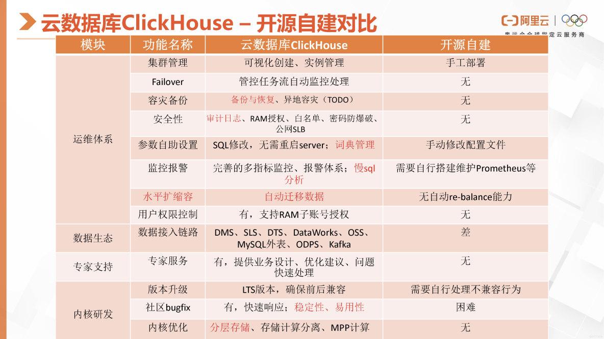 这份表格对比了阿里云数据库ClickHouse和开源ClickHouse在运维、数据生态专家支持以及内核研发等方面的差异。我们发现,在运维方面,阿里云的ClickHouse提供了可视化的创建和实际管理集群的功能,而自建则只能手动部署。在Failover方面,我们的系统具备管控任务流,能够自动监控处理异常情况或自动拉起失败节点。容灾备份方面,阿里云数据库ClickHouse也提供了备份恢复功能。在安全性上,我们支持日志审计、白名单、RAM授权等功能,并提供公网SLB和阿里云云网络等安全保障措施。另外,我们也支持通过SQL进行参数修改,并提供词典管理,控制台上可以直接操作。我们还提供完善的监控和多指标报警体系,能够对慢SQL进行分析。