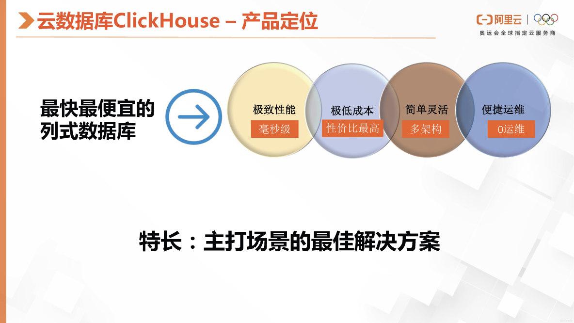接下来,进行第二部分,阿里云数据库的产品简介。阿里云数据库,产品定位是为最快最便宜的列式数据库,它在极致性能,最极低成本、简单灵活的架构、便捷的运维等,这几个目标上,去主打场景化的最佳解决方案。