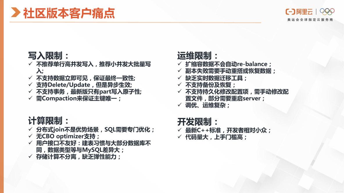然后再看一下我们社区ClickHouse版对有很多客户用上来之后有以下这些痛点,他的写入是有一些限制,他推荐你要聚合bach,要高频的并发,小粒度写。然后它的那个数据一致性是保证数据最终一次性,就是修改完就会立即可见,这个可见是指我那个多副本之间,它的数据全部是保证最终一致性的,如果是单机上,你去写完他返回提交成功,你是可以立即查的。然后它支持那个支持Delete/Update,但是异步生效的。而它不支持事务,最新版的这个ClickHouse社区版只支持part写入原子性。然后它需要后台的合并来保证主键的唯一性。