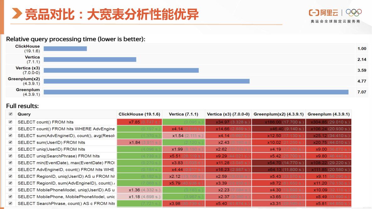 这里就是ClickHouse跟同类型的分析型数据库的性能对比,这是官网公布的一个PK的数据,查询速度还是很快,单表过滤分组聚合查询优势显著。