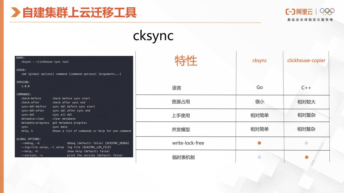 我们的迁移工具名为cksync,相较于社区提供的clickhouse-copier工具,cksync在语言、资源占用、上手使用、并发模型、write-lock-free以及临时表机制等方面都有其独特的特点和优势。左侧是我们工具的命令行参数列表。