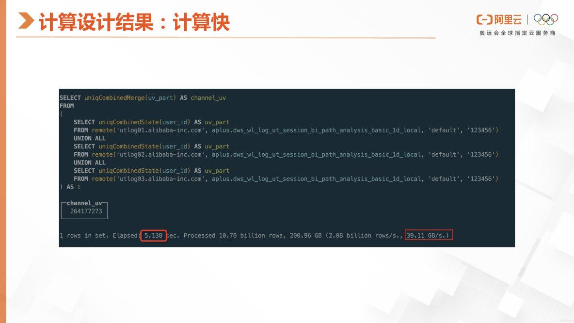 ClickHouse的查询性能非常快。例如,在处理一百亿行数据时,它可以执行UV操作,这种性能非常可观。