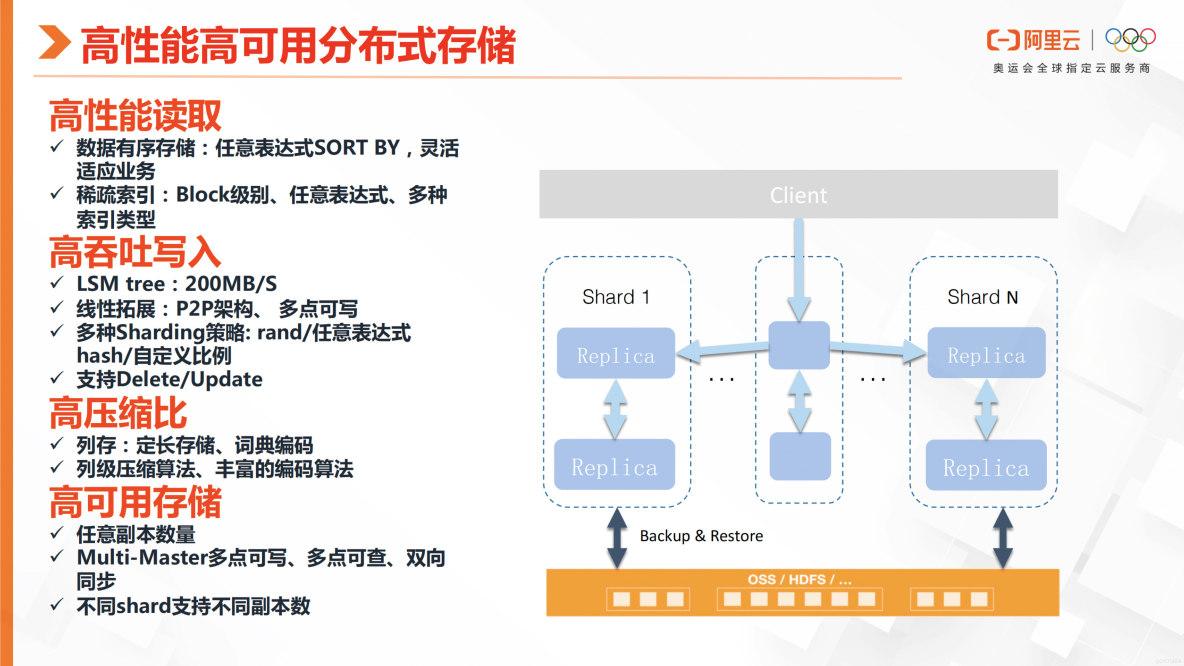 开源的ClickHouse它的高性能以及高可用分布式存储,主要是从这些方面去实现的。首先它的高性能读取,在数据存储时,它会根据排序键有序地存储数据。然后索引是组建的轻索引,它是Block级别的大粒度索引,所以在分析场景上是比较适合的。但是ClickHouse对于点查询来说,它的性能并不是很好。