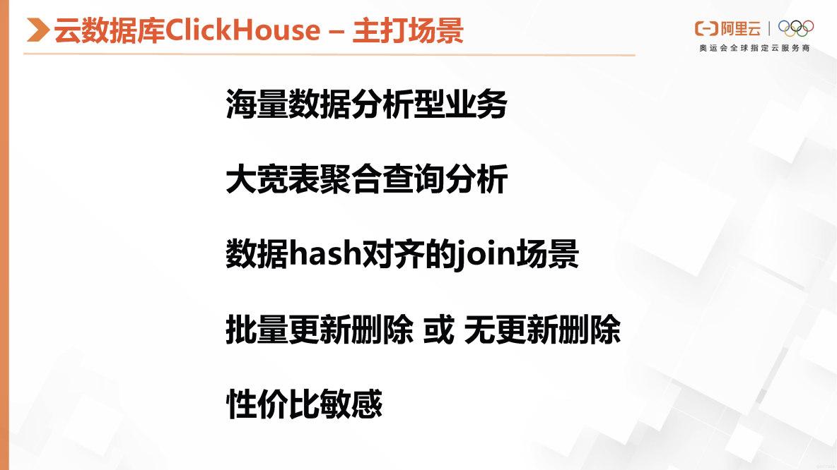 我们的主打场景是海量数据分析业务,包括大宽表查询和数据hash对齐的join场景等功能,这些功能虽然有很多限制,但能够满足大部分用户的需求。同时,我们的批量更新和删除操作,与其对应的part的key是有无关联,能够减少后续的更新和删除操作的开销,提高性价比,特别是对于那些对性价比比较敏感的用户来说。