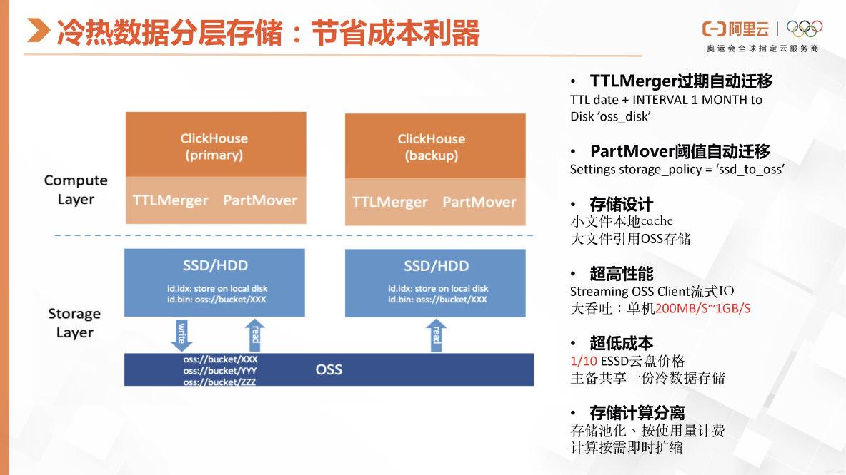 我们阿里云ClickHouse的冷热分层主要优势在于成本。可以提供更高性价比的查询分析引擎。用户在创建表时,可以告诉系统数据生命周期的关键字段,然后后台会根据这些信息,将Data part的数据移至冷盘、OSS或HDD上。这样,相较于全部存储在ESSD上,整体成本将大幅降低。
