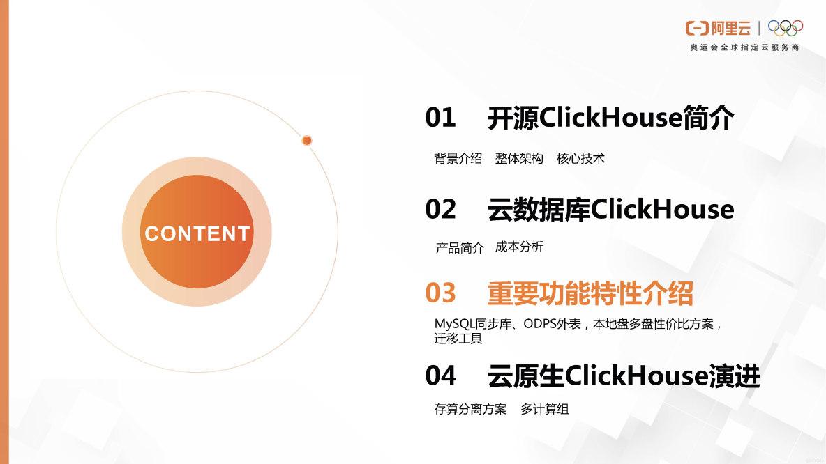 第三部分,我们将继续介绍阿里云ClickHouse的重要功能特性。主要内容包括数据同步工具、多盘存储,以及自建ClickHouse如何迁移到云端的工具介绍。