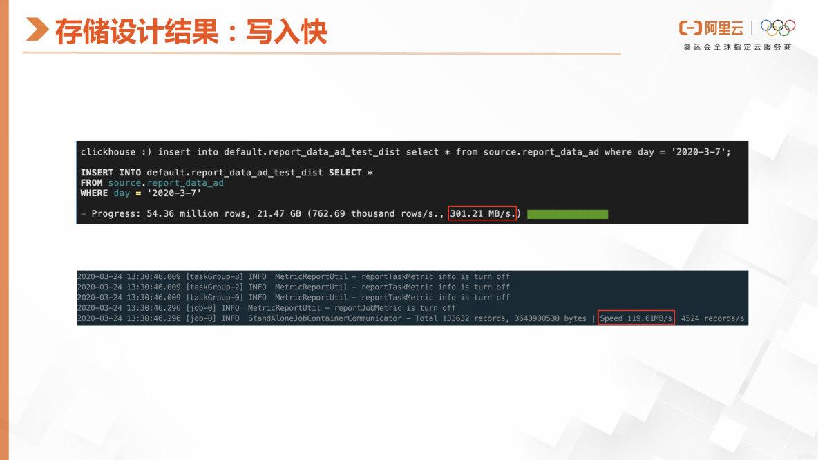 这张图可以看出,就是ClickHouse因为这个存储格式的设计,所以它在写入的时候,它的那个写入带宽是非常高的。