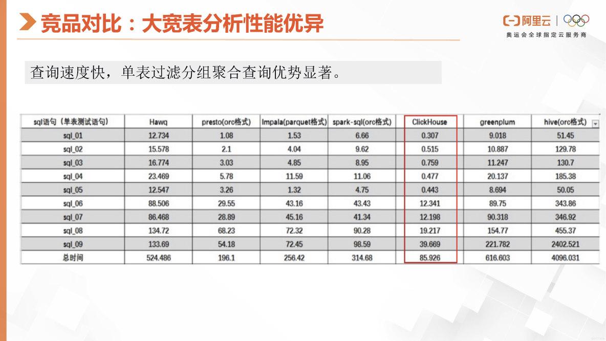然后这里是具体的一个性能数据,他是把get的数据集打包成了一个大宽表。接下来我们也将会介绍ClickHouse的性能表现。需要注意的是,在Join场景下ClickHouse的性能相对较弱。但是在大宽表的查询性能上是非常高,ClickHouse表现非常出色,这个是有目共睹的。