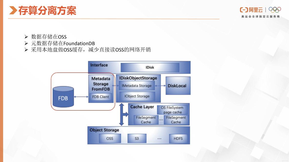 这张图详细介绍了ClickHouse的存算分离方案。在ClickHouse中,这个方案是在抽象的ID层实现的,类似于虚拟文件系统中的存算分离。