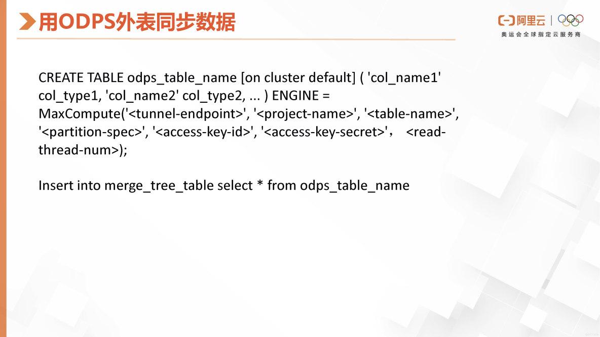 如果用户在阿里云的ODPS上有大量数据,而ODPS无法进行查询分析或运行批处理等非实时查询引擎任务,那么可以在ClickHouse中创建ODPS外表。接着,通过使用insert into select语句从ODPS外表同步数据到ClickHouse。完成同步后,便可以在ClickHouse中进行查询分析。