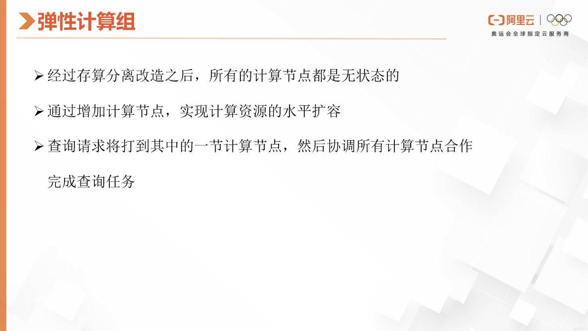 在那个弹性计算组上,我们主要解决的是节点计算资源水平扩缩容的问题。我们可以动态地增加计算节点,由多个节点协调所有计算查询任务,最后将结果汇总给发起节点,并返回查询结果。