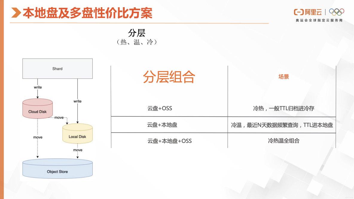 在多盘性价比方案中,我们提供了冷温热三层的分层存储。下面是一个分层存储的架构示意图。当数据需要立即写入时,我们会先将其写入云盘ESSD中,以便快速合并。然而,一段时间后或者当达到特定的TTL时,数据会被移动到本地盘。最后,如果时间更长,数据会被移动到OSS上。因此,我们提供了三种不同的分层存储组合,以满足不同的使用场景。例如,将云盘与OSS组合使用可以实现冷热分层,根据TTL进行归档进冷存。而将云盘与本地盘组合使用则可以实现冷温分层,将最近N天的频繁查询TTL存储到本地盘中。我们将根据用户的实际业务场景选择最适合的冷温热组合。