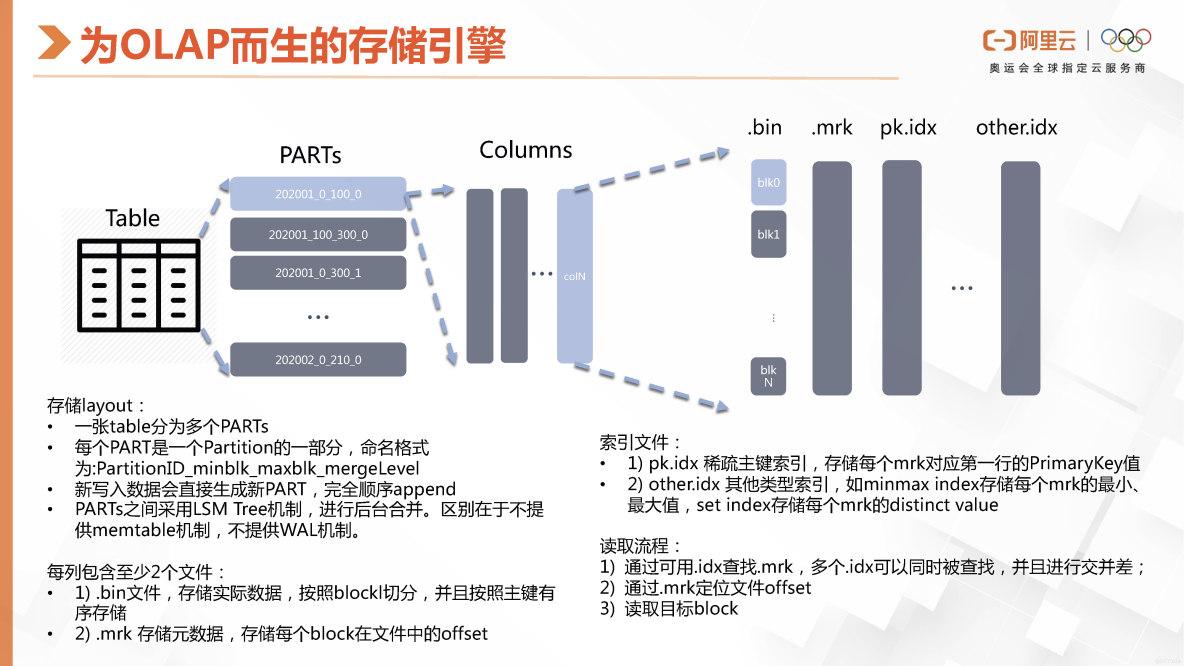 ClickHouse是专门为OLAP设计的一种存储引擎。它的底层存储格式是基于MergeTree的逻辑二维表,其中每行对应一个或多个数据目录下的PART(数据块)。在data目录下,会有许多索引文件,包括primary key index和其他索引文件。对于每个列,都有一组对应的数据文件(.bin)和数据索引文件(.mrk)。因此,每个数据块(block)的格式如下:命名规则为Part名称、Block ID、MergeLevel和Mutation Version(如果存在)。