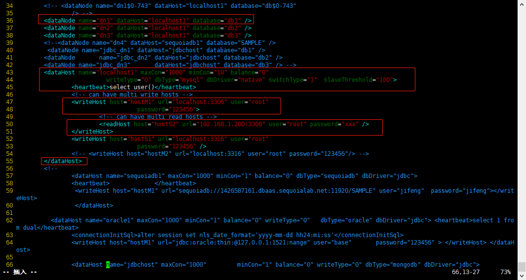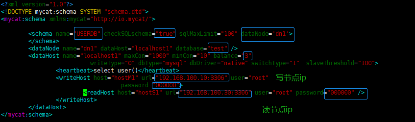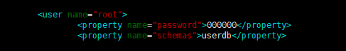 mycat的访问用户目录在/usr/local/mycat/conf下的server.xml文件,修改root用户访问密码与数据库,访问mycat的逻辑库为userdb,在schema.xml文件中指明了