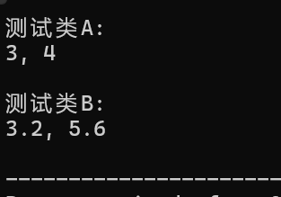 #include <iostream> using std::cout; using std::endl; // 类A的定义 class A { public: A(int x0, int y0); void display() const; private: int x, y; }; A::A(int x0, int y0): x{x0}, y{y0} { } void A::display() const { cout << x << ", " << y << endl; } // 类B的定义 class B { public: B(double x0, double y0); void display() const; private: double x, y; }; B::B(double x0, double y0): x{x0}, y{y0} { } void B::display() const { cout << x << ", " << y << endl; } void test() { cout << "测试类A: " << endl; A a(3, 4); a.display(); cout << "\n测试类B: " << endl; B b(3.2, 5.6); b.display(); } int main() { test(); }