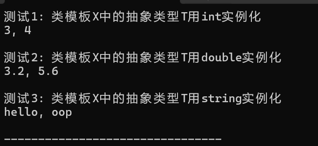 #include <iostream> #include <string> using std::cout; using std::endl; using std::string; // 定义类模板 template<typename T> class X{ public: X(T x0, T y0); void display(); private: T x, y; }; template<typename T> X<T>::X(T x0, T y0): x{x0}, y{y0} { } template<typename T> void X<T>::display() { cout << x << ", " << y << endl; } void test() { cout << "测试1: 类模板X中的抽象类型T用int实例化" << endl; X<int> x1(3, 4); x1.display(); cout << endl; cout << "测试2: 类模板X中的抽象类型T用double实例化" << endl; X<double> x2(3.2, 5.6); x2.display(); cout << endl; cout << "测试3: 类模板X中的抽象类型T用string实例化" << endl; X<string> x3("hello", "oop"); x3.display(); } int main() { test(); }