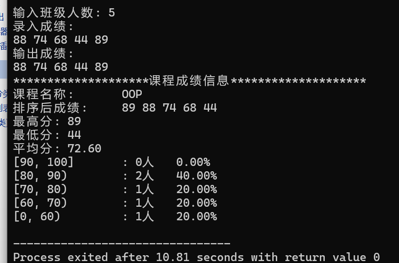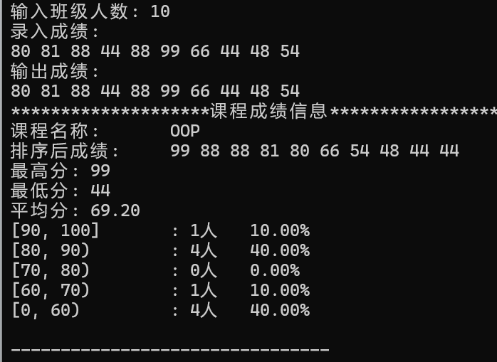 #include "GradeCalc.hpp" #include <iomanip> void test() { int n; cout << "输入班级人数: "; cin >> n; GradeCalc c1("OOP", n); cout << "录入成绩: " << endl;; c1.input(); cout << "输出成绩: " << endl; c1.output(); cout << string(20, '*') + "课程成绩信息" + string(20, '*') << endl; c1.info(); } int main() { test(); }
