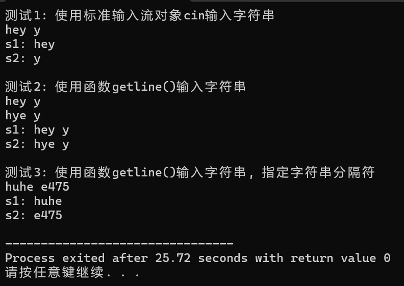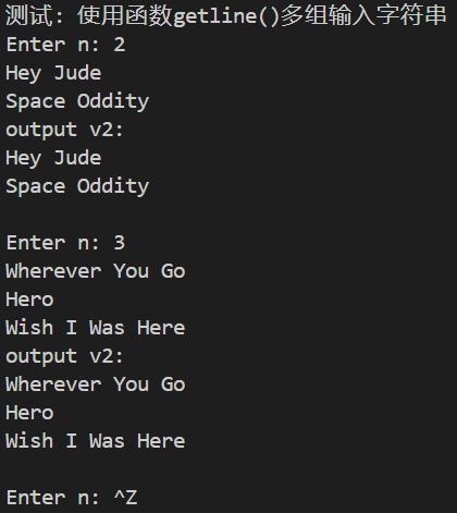 #include <iostream> #include <string> #include <vector> #include <limits> using namespace std; void output(const vector<string> &v) { for(auto &s: v) cout << s << endl; } void test() { int n; while(cout << "Enter n: ", cin >> n) { cin.ignore(numeric_limits<streamsize>::max(), '\n'); vector<string> v2; for(int i = 0; i < n; ++i) { string s; getline(cin, s); v2.push_back(s); } cout << "output v2: " << endl; output(v2); cout << endl; } } int main() { cout << "测试: 使用函数getline()多组输入字符串" << endl; test(); }