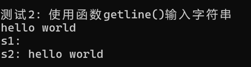 #include <iostream> #include <string> #include <limits> using namespace std; void test1() { string s1, s2; cin >> s1 >> s2; // cin: 从输入流读取字符串, 碰到空白符(空格/回车/Tab)即结束 cout << "s1: " << s1 << endl; cout << "s2: " << s2 << endl; } void test2() { string s1, s2; getline(cin, s1); // getline(): 从输入流中提取字符串,直到遇到换行符 getline(cin, s2); cout << "s1: " << s1 << endl; cout << "s2: " << s2 << endl; } void test3() { string s1, s2; getline(cin, s1, ' '); //从输入流中提取字符串,直到遇到指定分隔符 getline(cin, s2); cout << "s1: " << s1 << endl; cout << "s2: " << s2 << endl; } int main() { cout << "测试1: 使用标准输入流对象cin输入字符串" << endl; test1(); cout << endl; cin.ignore(numeric_limits<streamsize>::max(), '\n'); cout << "测试2: 使用函数getline()输入字符串" << endl; test2(); cout << endl; cout << "测试3: 使用函数getline()输入字符串, 指定字符串分隔符" << endl; test3(); }