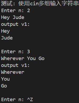 #include <iostream> #include <string> #include <vector> #include <limits> using namespace std; void output(const vector<string> &v) { for(auto &s: v) cout << s << endl; } void test() { int n; while(cout << "Enter n: ", cin >> n) { vector<string> v1; for(int i = 0; i < n; ++i) { string s; cin >> s; v1.push_back(s); } cout << "output v1: " << endl; output(v1); cout << endl; } } int main() { cout << "测试: 使用cin多组输入字符串" << endl; test(); }