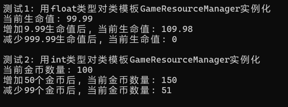 #include "grm.hpp" #include <iostream> using std::cout; using std::endl; void test1() { GameResourceManager<float> HP_manager(99.99); cout << "当前生命值: " << HP_manager.get() << endl; HP_manager.update(9.99); cout << "增加9.99生命值后, 当前生命值: " << HP_manager.get() << endl; HP_manager.update(-999.99); cout <<"减少999.99生命值后, 当前生命值: " << HP_manager.get() << endl; } void test2() { GameResourceManager<int> Gold_manager(100); cout << "当前金币数量: " << Gold_manager.get() << endl; Gold_manager.update(50); cout << "增加50个金币后, 当前金币数量: " << Gold_manager.get() << endl; Gold_manager.update(-99); cout <<"减少99个金币后, 当前金币数量: " << Gold_manager.get() << endl; } int main() { cout << "测试1: 用float类型对类模板GameResourceManager实例化" << endl; test1(); cout << endl; cout << "测试2: 用int类型对类模板GameResourceManager实例化" << endl; test2(); }