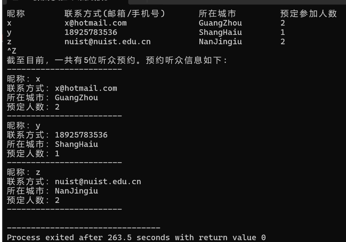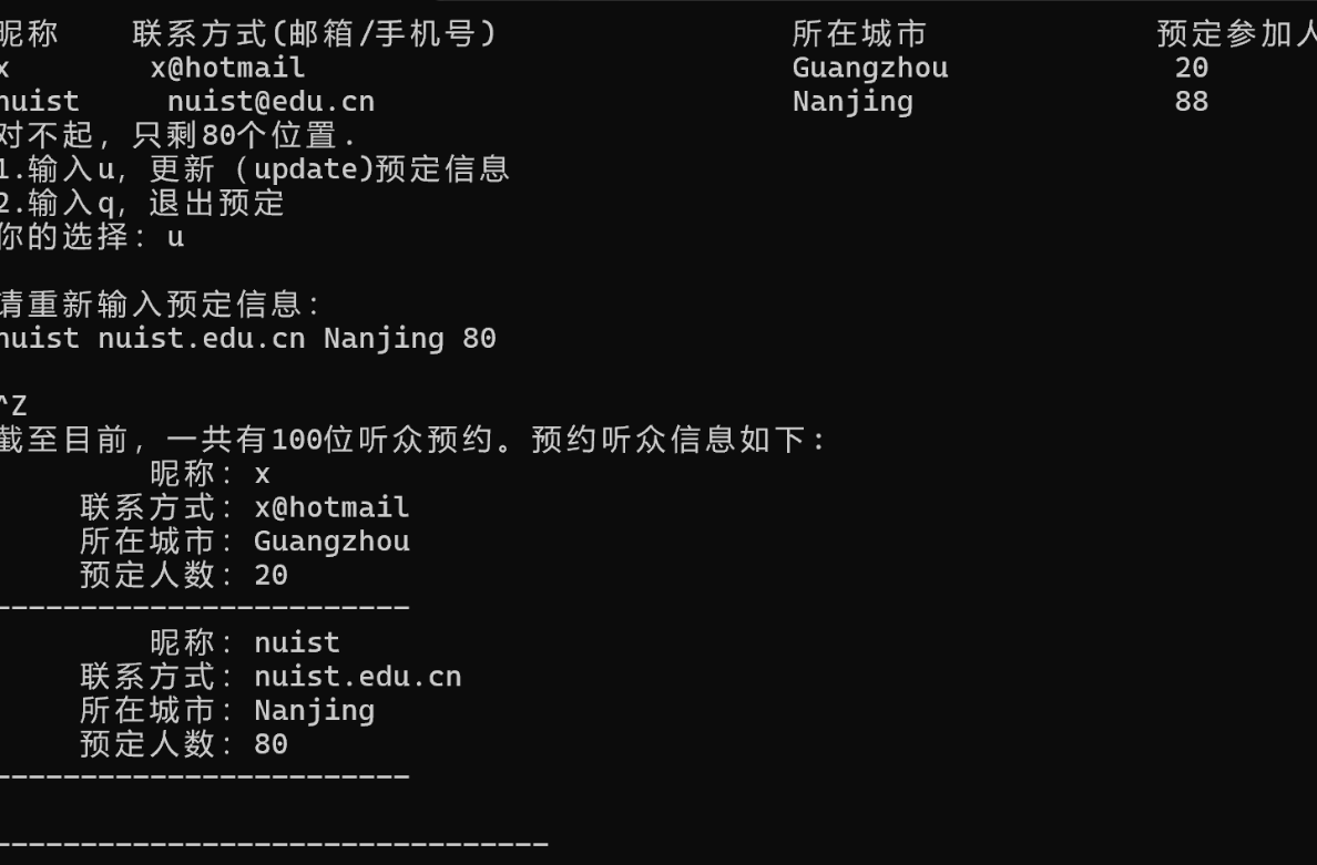 #include <iostream> #include <vector> #include<string> #include<limits> #include "info.hpp" using namespace std; int main() { const int capacity = 100; vector<Info> audience_list; string nickname, contact, city; int n,current_capacity=0; char choice; cout<<"昵称 "<<"联系方式(邮箱/手机号) "<<"所在城市 "<<"预定参加人数"<<endl; while(cin>>nickname>>contact>>city>>n){ cin.ignore(numeric_limits<streamsize>::max(), '\n'); if(current_capacity+n>capacity){ cout<<"对不起,只剩"<<(capacity-current_capacity)<<"个位置."<<endl; cout<<"1.输入u,更新(update)预定信息"<<endl; cout<<"2.输入q,退出预定"<<endl; cout<<"你的选择:"; cin>>choice; if(choice=='u'){ cout<<"请重新输入预定信息:"<<endl; cin>>nickname>>contact>>city>>n; cin.ignore(numeric_limits<streamsize>::max(), '\n'); } else continue; } if(current_capacity + n <= capacity){ audience_list.push_back(Info(nickname, contact, city, n)); current_capacity += n; } } cout << "截至目前,一共有" << current_capacity << "位听众预约。预约听众信息如下:\n"; std::cout << "------------------------\n"; for (const auto& info : audience_list) { info.display(); std::cout << "------------------------\n"; } return 0; }