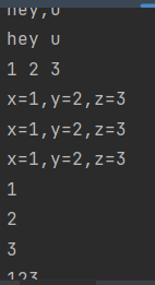 #print输出的几种手法 #用法1:用于输出大哥字符串或单个变量 print('hey,u') #用于输出多个数据项,用逗号分隔 print('hey','u') x,y,z=1,2,3 print(x,y,z) #用法3:用户混合字符串和变量值 print('x=%d,y=%d,z=%d'%(x,y,z)) #方法1:传统c风格 print('x={},y={},z={}'.format(x,y,z))#s.format()方法 print(f'x={x},y={y},z={z}')#方式3:f-string方式 #其他:输出后是否换行 print(x) #默认输出后换一行 print(y) print(z) print(x,end='') #输出结束后,不换行:通过end指定数据项之间的分隔符 print(y,end='') print(z)