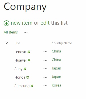 Company列表,其中的Title是Company的名字,Country Name是一个lookup列,lookup到Country列表的Title:
